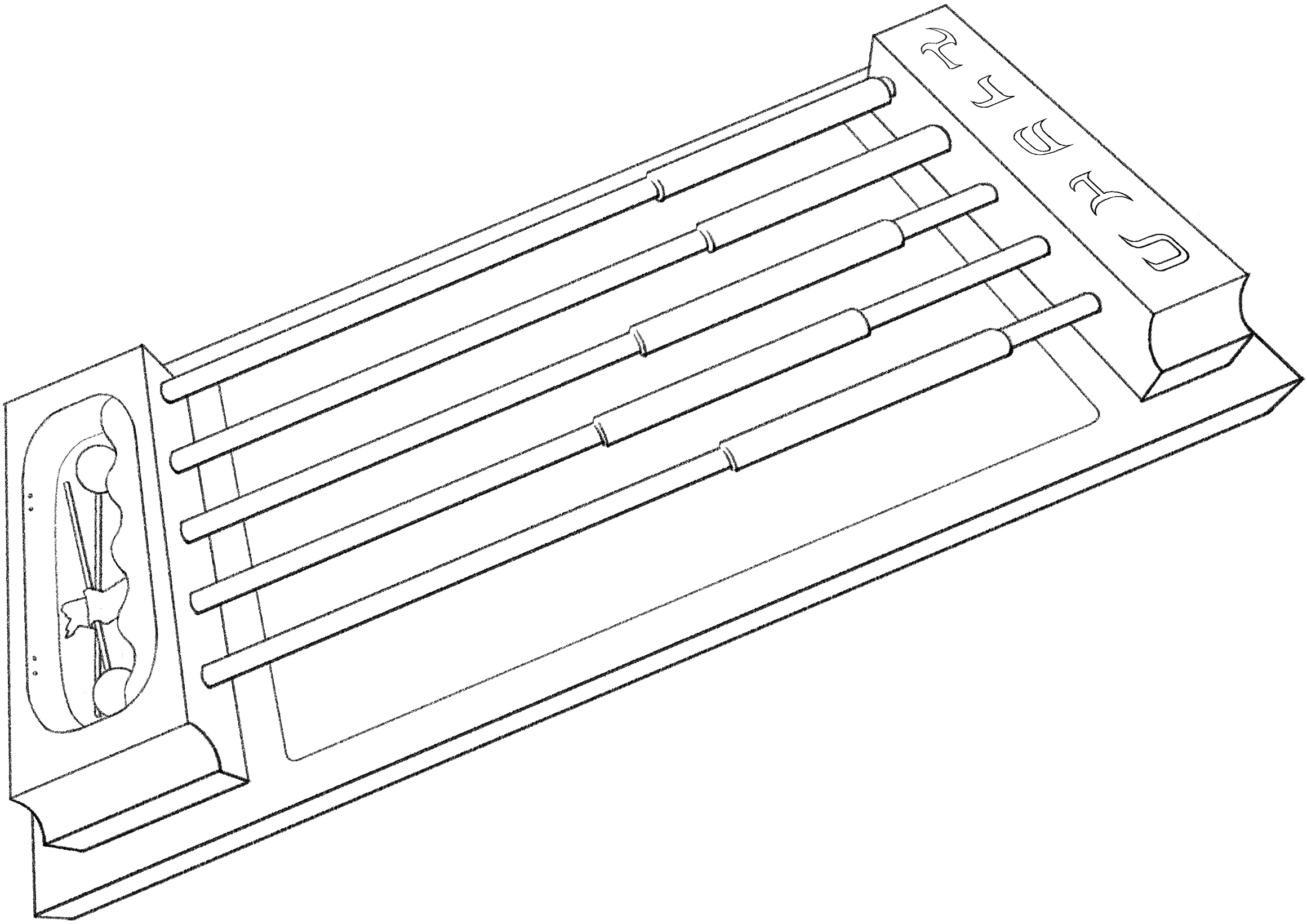 Pen picked up the item and blew the dust off it. Atop an ell-wide wooden square, two blocks of carefully colored metal and ivory held five thin rods in even columns, each carrying about two fingers width of a larger rod that slid up and down the thin one quite smoothly. Inside one of the blocks, a compartment missing its lid held two tiny mallets attached by duct tape. Traces of rust had collected at some of the edges, but other than that, the craftsmanship was decent. She looked up at the soldier. »Sir, these are chimes.«