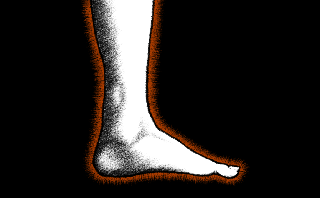 It sounded strange to hear his own foot sigh. “Us feet have evolved over centuries to support the human structure you call ’body’. Nature has shaped us to run on a variety of soils, in different climates… But these shoes you shackle us in are an abomination. The soles are too thick! Make you run heel-first, what a torture… We weren’t designed that way! Can’t you feel how it reshapes your spine, making it crooked? Hell, perhaps you could have escaped the law if you had bothered once to check how the pillars of your existence were doing!“